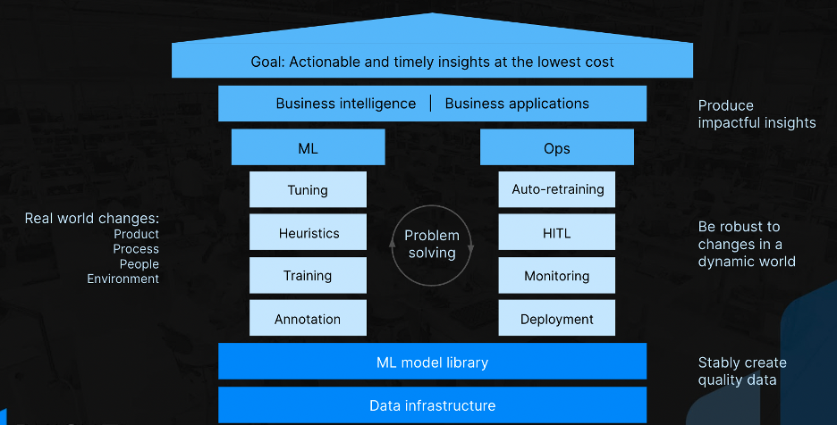 Figure 1 below, created with my colleague Sujay Narumanchi, lays out the core elements of The MLOps House. At the very foundation is the data infrastructure responsible for managing the data flowing through the system and the ML models from which an ensemble is created to deliver the best results. With this ensemble selected, the two pillars of the house, ML and Ops, step in. The ML pillar ensures that the ML is tuned well and delivered while the Ops pillar ensures that an active feedback loop is running and that the ML models remain tuned even as the physical world changes. The business application layer delivers the intelligence and workflows contextually so the users can focus on their jobs, not on the idiosyncrasies of the AI. Finally, and perhaps most importantly, the central function is problem solving — figuring out what is going wrong in a non-intuitive system and quickly resolving it so the systems run and meet the business’s committed SLAs.