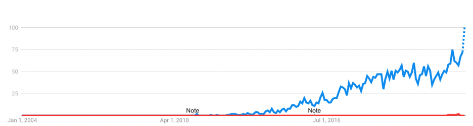 As the technology matures further, we will see more AI in both the infrastructure layer and in the business solutions. Businesses are going to need more people capable of digging into the technical side of the solution. The graph in Figure 2 shows both the exponential growth in the number of search queries in Google for “DevOps Engineer” as well as the minuscule search for “MLOps Engineer” today. As MLOps goes mainstream, the MLOps graph will be a phase shifted graph like the DevOps chart, pointing to an exponential growth in opportunity.