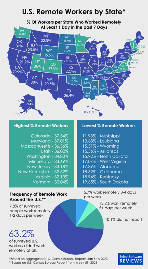 The analysis, released recently by HR software advisory firm SelectSoftware Review, found Colorado (at 37%) has the most significant percentage of workers in 2023 regularly working from home at least one day a week. In contrast, 12% of workers in Mississippi work from home on a regular basis. That’s the lowest percentage in the nation.